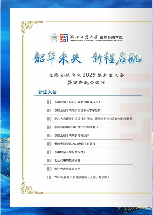 【快乐校园×青年·艺起来】第一版主 丨2025级新生大会暨迎新晚会就在今天!第一版主 2025年12月4日 11:30浙江韶华未央新程启航第一版主 2025级 新生大会暨迎新晚会12-4用歌声治愈人心,用舞蹈开启新程还有创意小品,乐器独奏节目亮点抢先看,提前点燃期待值节目抢先看马踏飞燕啦啦操表演人员:泰隆舞队表演形式:啦啦操节目介绍:在代码与机械构筑的终极都市,诞生了新世代“仿生舞姬”。她们的每一个关节都是精密算法,每一次律动都是电流奔涌。钢铁之躯能以绝对力量演绎风暴,也能用超越人类的精准,在数据洪流中捕捉到最古老的频率——“爱”。《甄嬛传》表演人员:普惠金融2501表演形式:二创配音节目介绍:当学术的数据闯入紫禁城的权谋,一场因查重系统故障引发的学术风波,即将在滴血验亲的经典场景中爆笑上演!《当代大学生生存指南》表演人员:普惠金融2502表演形式:小品节目介绍:新生小周开启入学闯关路,校园套路暗藏其中,小品以鲜活笑料撕开校园陷阱假面——青春向阳,反诈筑墙,护好每一份热忱与权益!《Always Online》表演人员:普惠金融2503表演形式:合唱节目