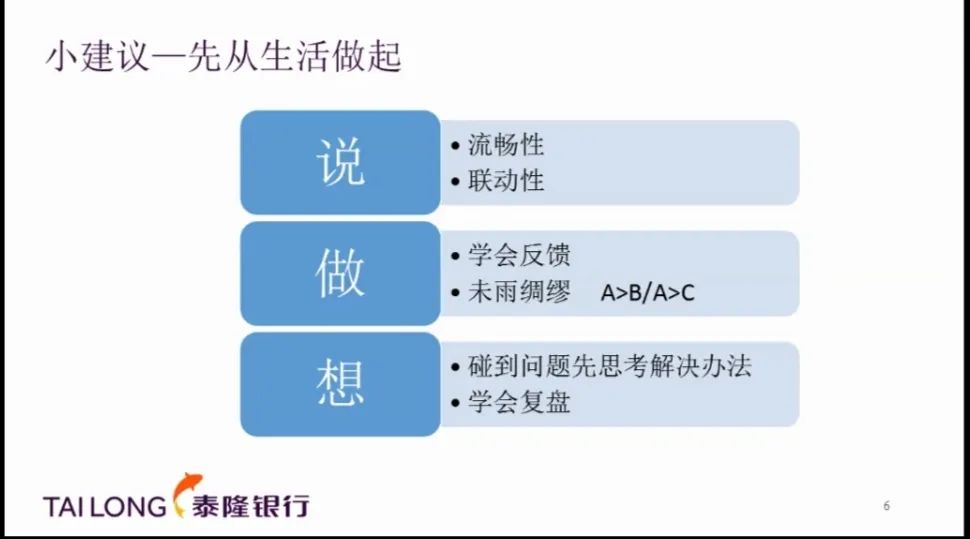 ▶“说”:保持思想和语言表达的流畅性及联动性,即在说话时大脑联动地进行深入思考;/span>