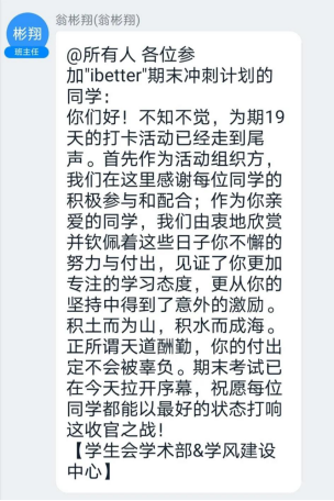 为提高同学们期末复习效率、营造帮扶和鼓励的学习氛围、加强自我监督,学院学生会学术部和学院学风建设中心联合在期末阶段开展/font>/span>“ibetter/font>”期末冲刺计划/font>/span>,在形成激励氛围的同时为第一版主