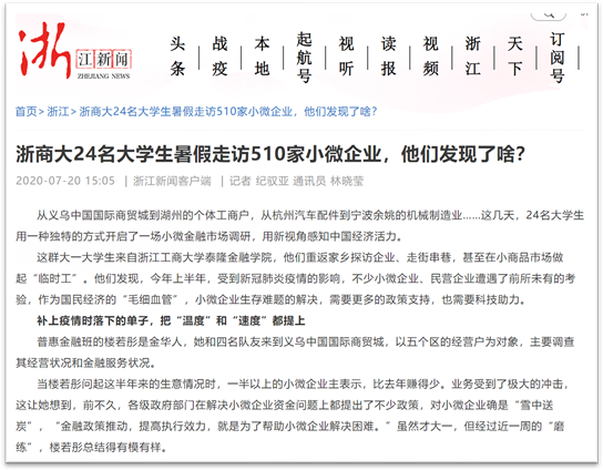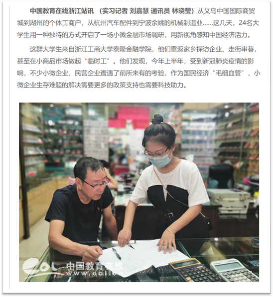 24/span>名大学生,重返家乡探访企业、走街串巷,甚至在小商品市场做起“临时工”。从义乌中国国际商贸城到湖州的个体工商户,从杭州汽车配件到宁波余姚的机械制造业……此次暑期社会实践调研团队一共分为6/span>组,每组4/span>人,分别在杭州、温州、宁波、金华等地进行,共走访了510/span>家小微企业。/span>/p> 他们用一种独特的方式开启了一场小微金融市场调研,用新视角感知中国经济活力。今年上半年,受到新冠肺炎疫情的影响,不少小微企业、民营企业遭遇了前所未有的考验,作为国民经济“毛细血管”,小微企业生存难题的解决需要更多的政策支持也需要科技助力。/span>/p> 调研团队主要了解家乡的小微企业的经营状况和金融服务情况,在调研的这段时间,他们接触到了各种类型的小微企业,身边随处可见的小吃店、服装店、超市,60%/span>小微企业的月营业额在5/span>万元以下。再从企业规模看,这次调研结果显示,60%/span>的小微企业员工不到5/span>人,经营年限在5/span>年以上的企业占50%/span>。小微企业及个体户中,大部分是联系千家万户的“小店经济”,在调研中发现,20.5%/span>小微企业及个体户面临现金流危机。其中,有融资需求的小店中,70%/span>的小微企业主表示只要给予一点支持,就能很快迈过难关。/span>/p> 虽然这些大学生都才大一,他们宣传国家出台的一系列金融综合改革政策外,还倾听小企业主们的心声,并真实地将他们的所见、所闻、所感记录了下来。通过这次调研的内容可以了解当地小微金融市场需求状况,结合现有金融产品系,确定未来可提供的具体产品策略,包括担保、利率、期限和还款方式等主要要素,另外本次实践调研中获得的调研数据,也将会用于之后的“挑战杯”大学生课外学术作品竞赛中。这是一次很有意义的调研活动,让还在学理论的大一学生回到家乡调研,感受中国经济的脉动,既有一种情怀也有一种责任。/span>/span>/p> 这次意义特别的调研活动受到许多校内外媒体的关注和报道,包括中国教育在线、钱江晚报、浙报融媒体、浙江新闻、科技金融时报等多家媒体都对第一版主