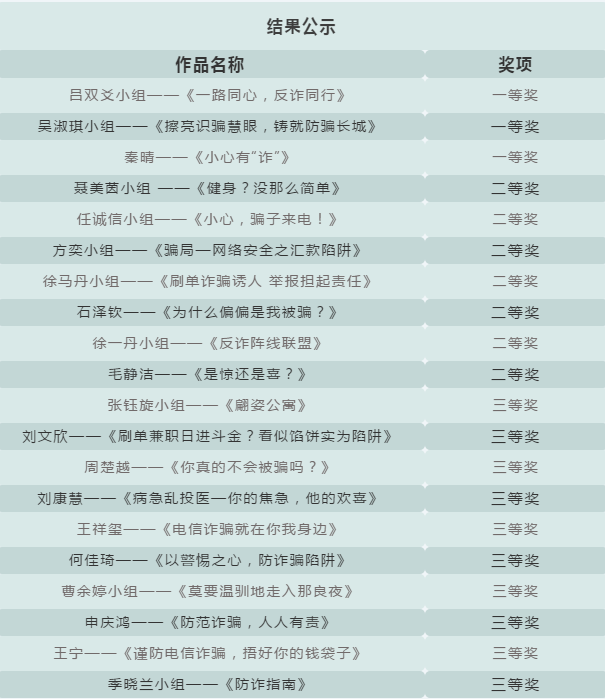 /span> /span> /span>骗人之心不可有,防骗之心不可无。本次大赛让大家更加深入地了解了各种各样的诈骗手段,提高了同学们的防诈反骗意识。同时,也让大家意识到“人人说防范,人人懂防范”不能只是一句口号,而要切实地践行起来,共建一个人人识诈、人人反诈的和谐社会。/span>/p>