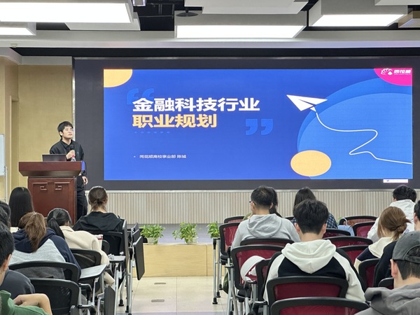 本次研学由同花顺高校大客户经理张书源主持。首先,是同花顺高校运营总监陈城主讲《金融科技行业职业规划》:主要阐述职业规划的基本方法、注意事项和实施路径,阐述金融科技行业的发展历程、银行和券商的数字化转型现状和未来,阐述当前时代背景下金融机构和金融科技企业中各个岗位的就业要求及职业发展路径,最后为同学们在校期间的学习和就业规划提供个人建议和躲坑指南。