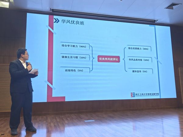 大会伊始,学院学生会主席团成员陈鸿帆学长对优良学风班的考核要求作了详细介绍,并公布了2021级和2022级各班优良学风班量化初评结果。