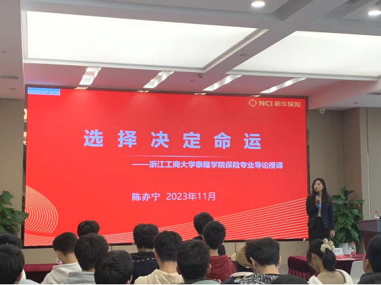 新华保险浙江分公司人力资源部负责人陈亦宁女士为同学们带来一场职业生涯规划讲座,陈总从两份简历谈起,分析了同学们在大学期间要提升的能力和努力的方向。她还指出,成功的人都是活到老、学到老,从而鼓励同学需要好好学习,提高自己的专业能力。要从书里学、跟高人聊、在事上练,要坚持锻炼,通过复盘反思和实践,找出规律性的解决办法。同时,同学们要有目标感和解决问题的能力,才能够走得更远。为同学们引导职业规划方向时,陈总提到,行业选择很重要,大家要选择朝阳行业,尽可能选择头部的企业。