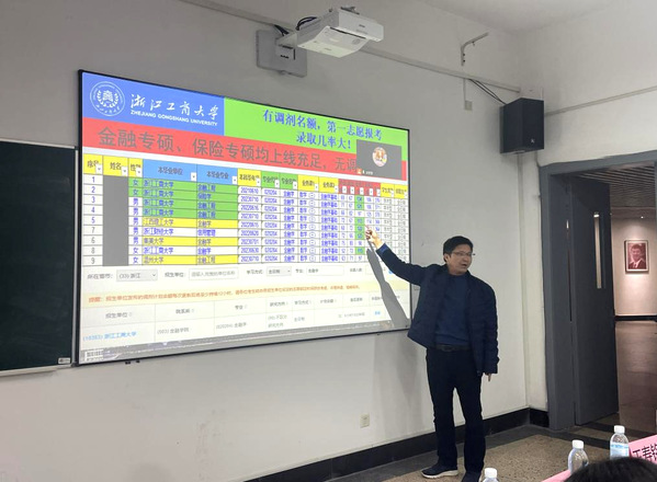活动伊始,姜兵老师结合招聘简章,讲到学历是就业时的“敲门砖”,在专业赛道上继续深造,能让未来的发展更有后劲。接着姜老师带着大家一起分析了部分财经类院校的硕士研究生招生目录和报录比、复试分数等信息,同时他嘱咐大家在大学期间学好数学三、线性代数、宏微观经济学等课程,为考研打好基础,另外在选择报考院校时要科学定位,根据自身情况理性选择报考地域和报考学校。