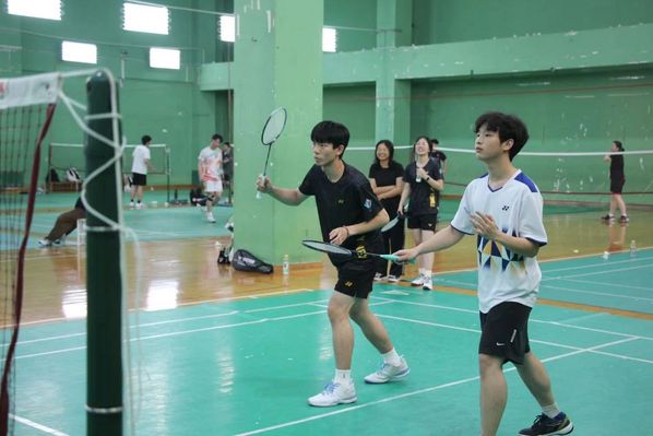 5月18日下午14:00,第一版主 羽毛球男双周煦、刘亮组合和袁顺鑫、魏子隆组合踏上了商大杯羽毛球的征程。
