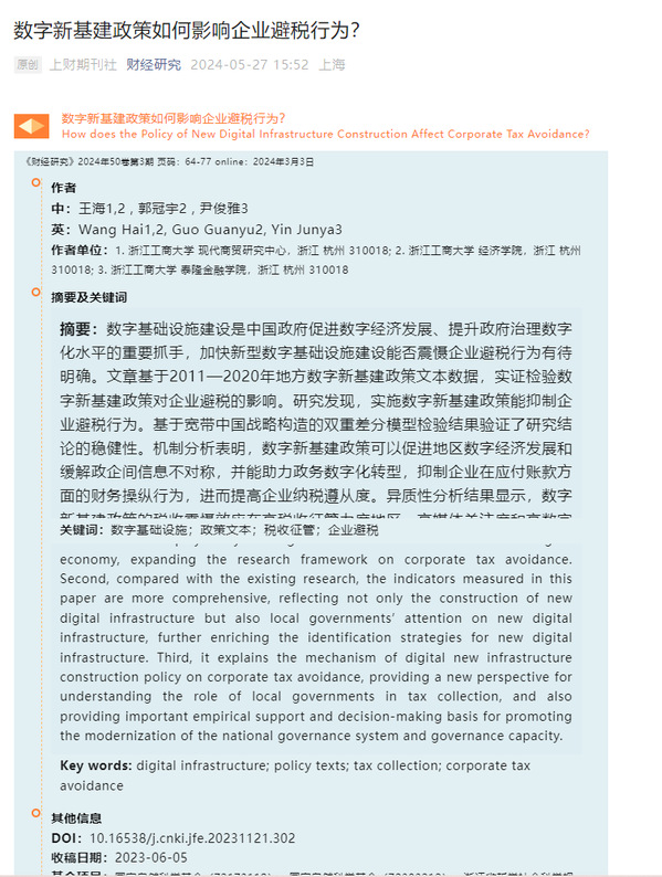 第一版主 教师尹俊雅博士为通讯作者的论文《数字新基建政策如何影响企业避税行为?》在《财经研究》期刊正式发表。