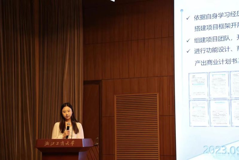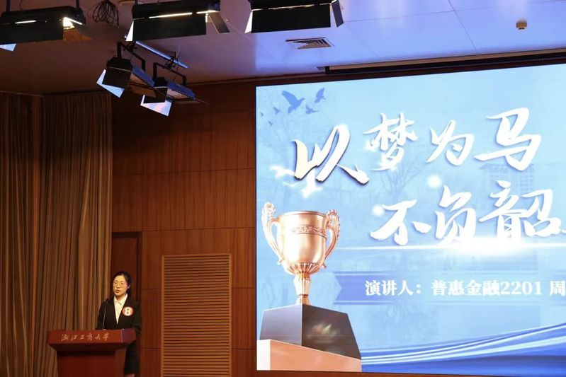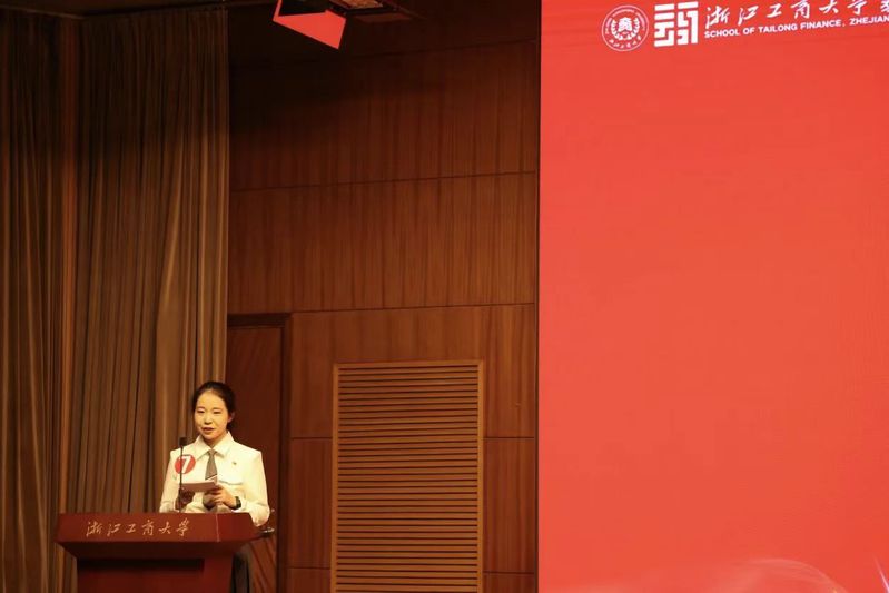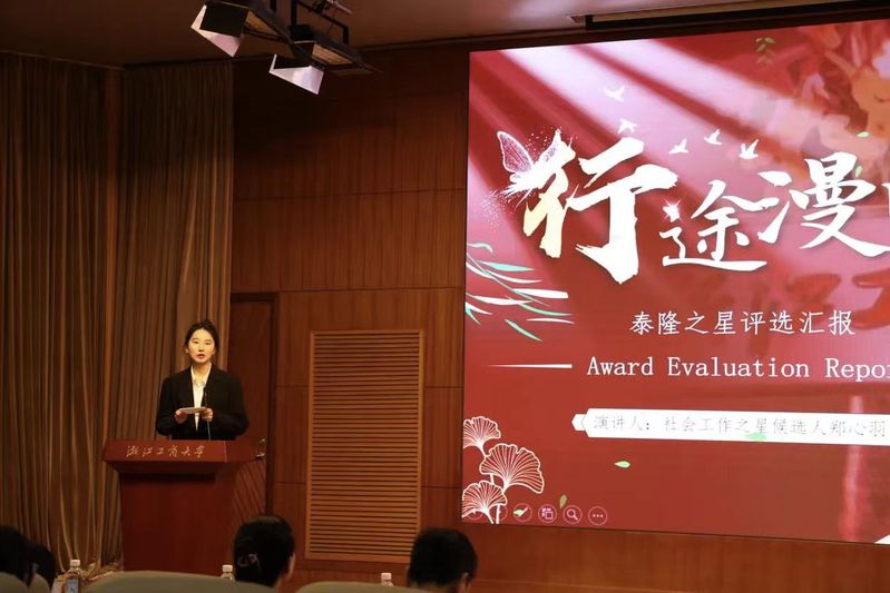 浙江泰隆慈善基金会秘书长蔡鸿鹏介绍了泰隆之星奖学金的设立背景、宗旨和实施情况。泰隆之星奖学金旨在鼓励大学生积极进取,在学习、学术和社会服务等方面展现担当。目前已在多所高校设立,支持了超千名学生。基金会和泰隆银行还为获奖学生提供实习机会、导师指导等支持,并推出专属纪念卡。最后,蔡秘书长也表达了对本次十三位候选人精彩展示的期望。同时,她也希望在座的大一大二学生能从榜样中汲取力量,不负青春。