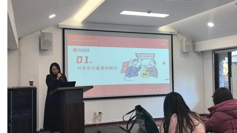 移步至会议室,一场实用且生动的防诈骗课堂随即展开。浙江分公司业务中心杨婷婷老师结合当前金融诈骗的高发态势,详细拆解了多种常见诈骗类型的作案手法 —— 从诱惑性极强的刷单返利类诈骗、虚假网络投资理财类诈骗,到贴近生活的虚假购物服务类诈骗、冒充电商物流客服类诈骗,再到隐蔽性较强的冒充领导熟人诈骗、婚恋交友 “杀猪盘”、网络游戏虚假交易诈骗、机票退改签诈骗等,每一种都配上具体案例分析,让同学们清晰识别诈骗陷阱。同时,工作人员还分享了实用的防骗技巧与应急处置方法,帮助大家普及金融诈骗知识,筑牢个人财产安全的 “防火墙”。