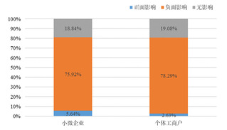 调查发现:超过七成的小微企业和个体工商户的经营活动都受到了新冠疫情的负面影响,其中住宿和餐饮业、教育以及制造业等行业受到的冲击最大。在此背景下,小微企业迫切需要政府给予资金扶持和政策保障。超过五成的小微企业和个体工商户会积极主动去了解政府最新的扶持政策,大约三成的小微企业和个体工商户最终能够享受到政策红利。税收和融资的优惠政策最受到小微企业的欢迎。政府扶持政策不仅可以为小微企业提供支持,更重要的是能够鼓舞企业的信心。超过九成的小微企业和个体工商户对已实施的政策表示满意,并对未来充满信心。1.七成小微企业受到疫情负面影响,住宿餐饮、教育与制造业受影响最大将新冠疫情的影响划分为正面影响、负面影响和无影响。调查结果表明,超过七成的小微企业和个体工商户都受到了新冠疫情的负面影响,仅有不到两成的小微企业和个体工商户没有受到影响,以及极少量的小微企业和个体工商户受到了正面影响。这表明,新冠疫情给小微企业和个体工商户带来了较大的冲击。图1 新冠疫情对小微企业和个体工商户的影响进一步来看主要有哪些企业遭受了冲击。将小微企业和个体工商户所处的行业进行划分,受负面影响最大的三个行业分别是住宿和餐饮业,教育