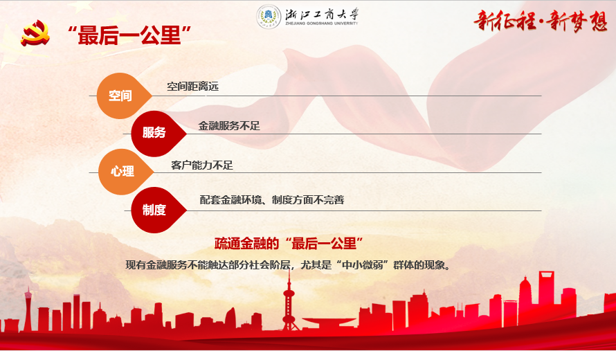 杨弋老师首先用一个“当初大家为何报考金融类的专业”的问题跟场下同学们互动,从而阐述出普惠金融的本质——就是要发挥金融本来的普惠性质,让每个个体都能享有平等的金融资源的获得渠道,进而走向共同富裕。然而在这条路上,还有艰难的“最后一公里”要走,这在现实中的概念就是我国目前的金融服务仍然存在一些不足之处。杨弋老师讲到,尽管我国目前已经做了许多这方面的探索,但是仍需普惠金融方面的专业人才去帮助疏通这“最后一公里”。