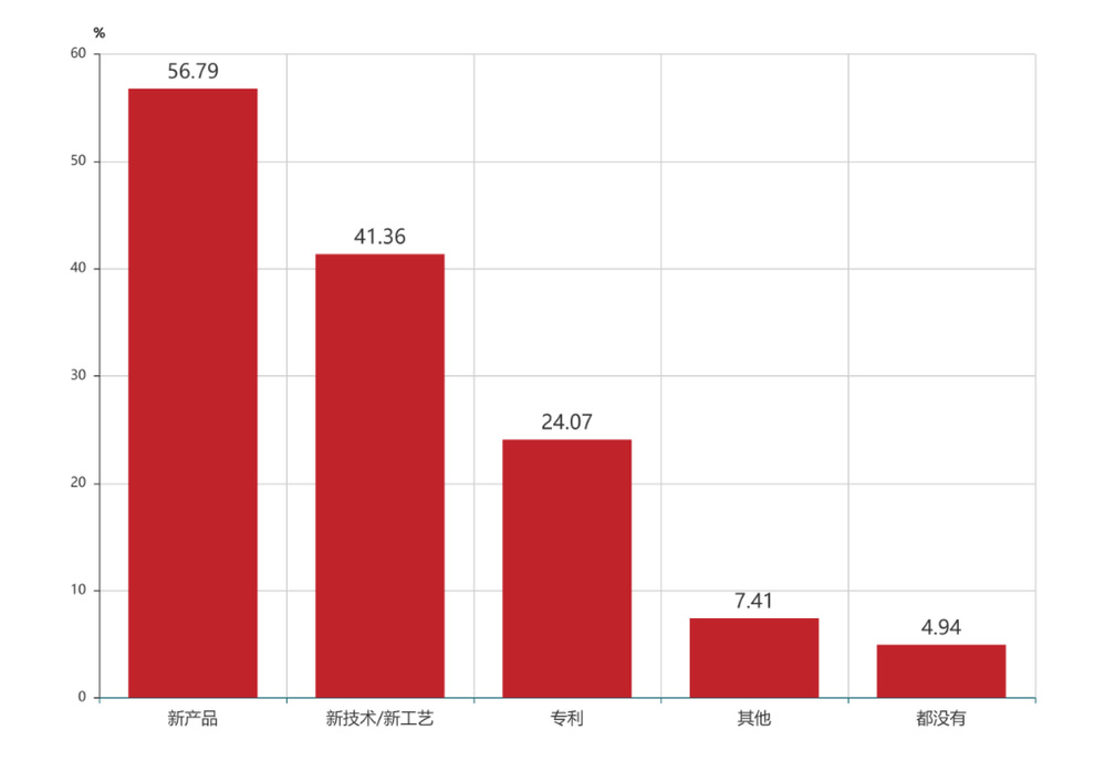 调查结果显示,在有研发创新支出的小微经营主体中,研发创新转化为新产品的企业比例为56.79%,转化为新技术/新工艺的比例为41.36%,转化为专利的比例占比24.07%。该结果表明,小微企业创新相对务实,研发创新主要转化为新产品。此外,有5%的小微企业研发创新支出没有转化结果,该结果在一定程度上表明小微企业承担高风险创新活动意愿不强。