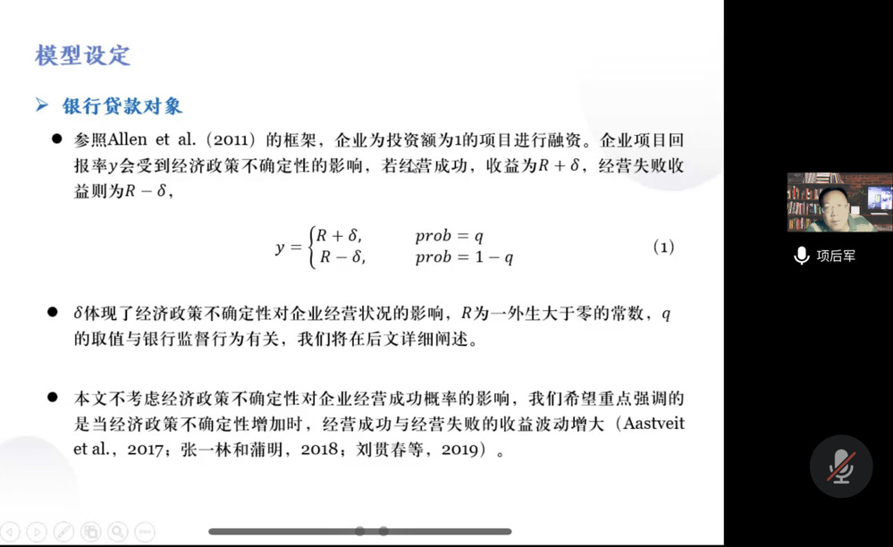 项后军教授从研究背景与意义、理论模型、数据来源及变量选取、实证结果及分析、稳健性检验、结论与启示等6个部分全面阐述了经济政策不确定性与银行数字化转型对风险承担的影响。首先,项后军教授通过在银行贷款定价与信贷筛选的理论模型中引入经济政策不确定性与银行数字化转型,探讨了对银行风险承担的影响,得到如下推理:(1)银行风险承担与经济政策不确定性之间呈倒U型关系,银行风险承担会随着经济政策不确定性的增加先上升后下降;(2)由于银行特征差异,大银行所对应的不确定性感知阈值相比中小银行更加靠右;(3)银行数字化转型提高银行对风险的敏感性,推动银行的不确定感知阈值向左移动,且银行数字化转型的调节效应目前主要体现在大银行层面。之后,为证实以上推论,项后军教授运用2010年-2018年的89家商业银行的非平衡面板数据建立回归模型,实证检验结果、稳健性检验结果及分样本异质性分析结果均证明上述推论的准确性。