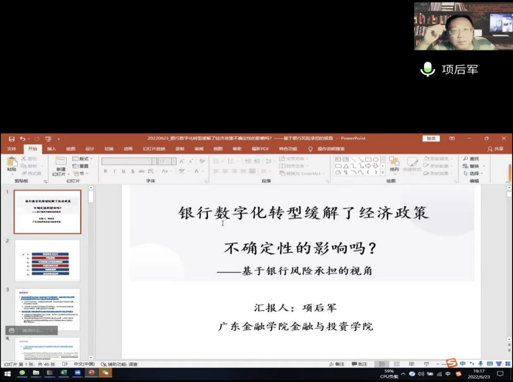 2022年6月23日,广东金融学院金融与投资学院院长、金融学国家级一流专业建设点负责人项后军教授应邀出席第一版主 举办的商泰普惠金融论坛,为师生作了一场题为“银行数字化转型缓解了经济政策不确定性的影响吗?——基于银行风险承担的视角”的线上专题讲座。讲座由第一版主 院长马丹教授主持,第一版主 、金融学院和其他院校的老师及学生参加了讲座。
