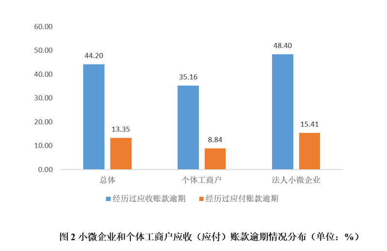 如图1和图2所示,47.79%的小微企业和个体工商户有应收账款,32.00%的小微企业和个体工商户有应付账款;44.20%的小微企业和个体工商户经历过应收账款逾期,而只有13.35%的小微企业和个体工商户经历过应付账款逾期。可见,小微企业的应收账款与应付账款存着错配,具体表现为有应收账款的小微企业和个体工商户比例远高于有应付账款的小微企业和个体工商户比例,且面临应收账款逾期的小微企业和个体工商户比例远高于应付账款逾期的小微企业和个体工商户比例。因此,小微企业会经常面临流动性资金需求。