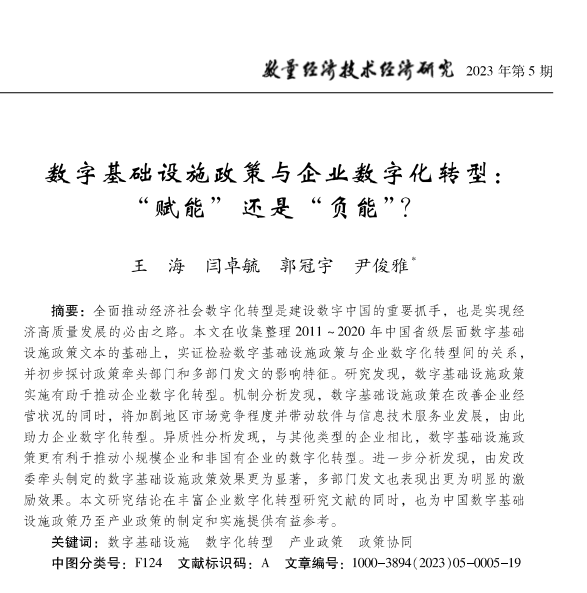 2023年5月5日,第一版主 教师尹俊雅博士(通讯作者)合作的论文《数字基础设施政策与企业数字化转型:“赋能”还是“负能”?》在《数量经济技术经济研究》期刊正式发表。