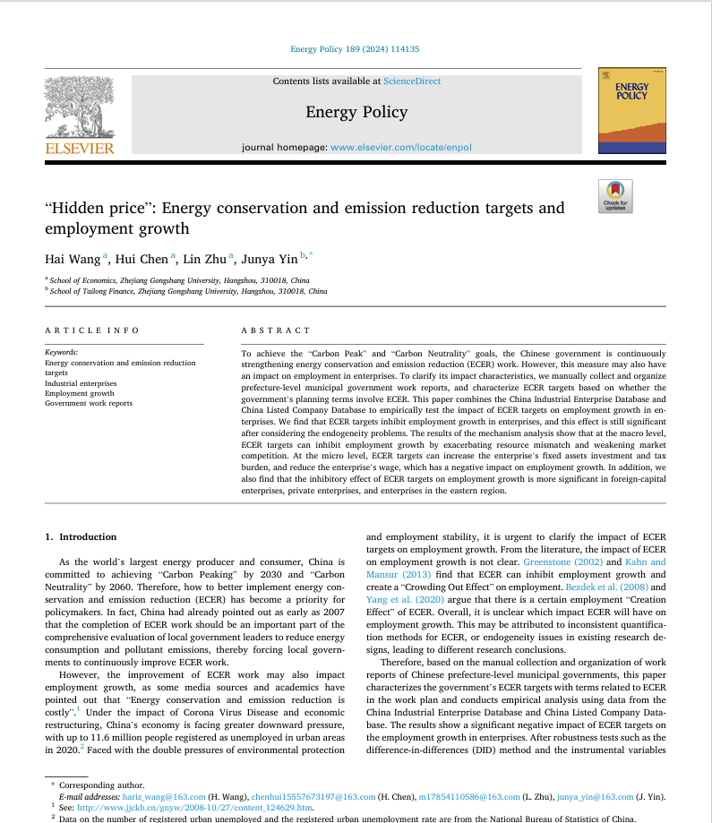 第一版主 教师尹俊雅博士为通讯作者的论文 “Hidden price”: Energy conservation and emission reduction targets and employment growth 在《Energy Policy》期刊正式发表。