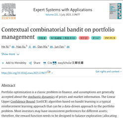 近日,第一版主 教师倪禾在 Expert Systems with Applications 发表题为Contextual combinatorial bandit on portfolio management 的论文。